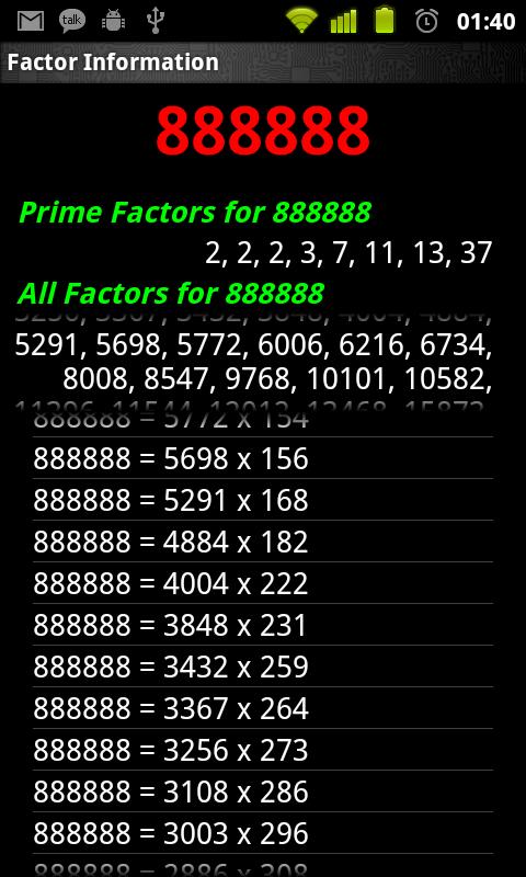 4. Open “Find Factors” and enter a number (2 to 999999) to load it’s Prime Factors and All Factors. You can further search by clicking on the Options menu and selecting “Find Factors”