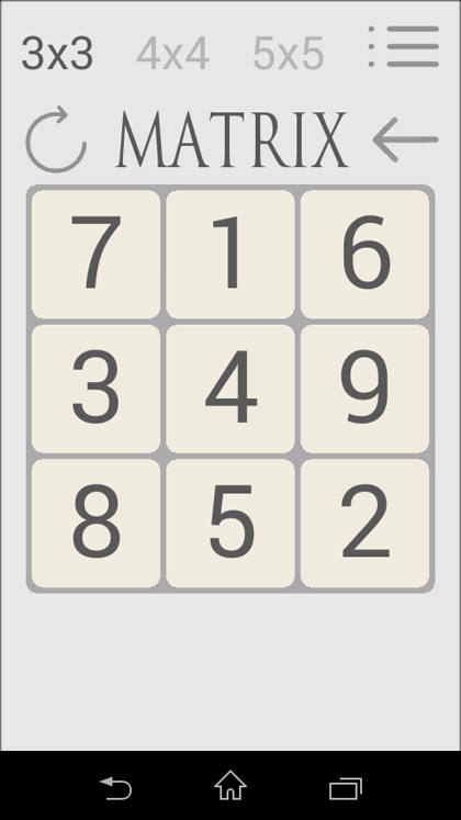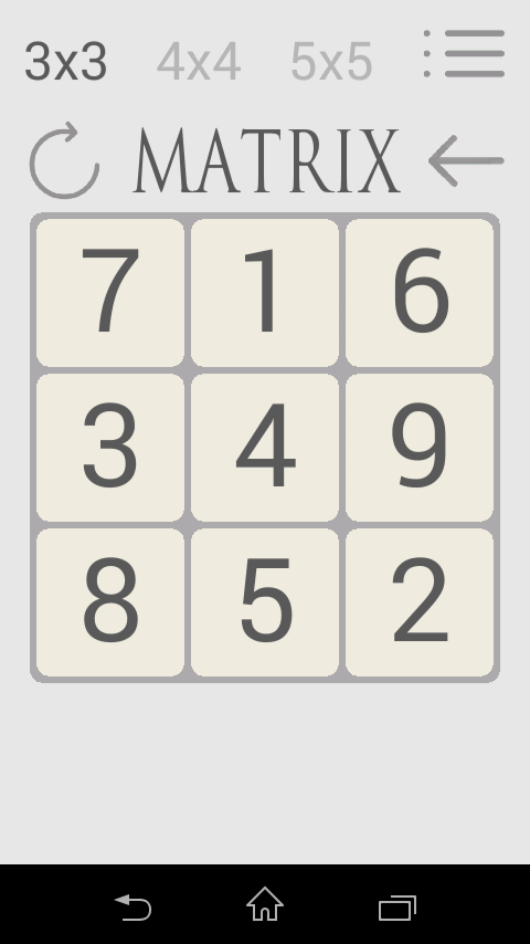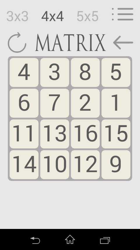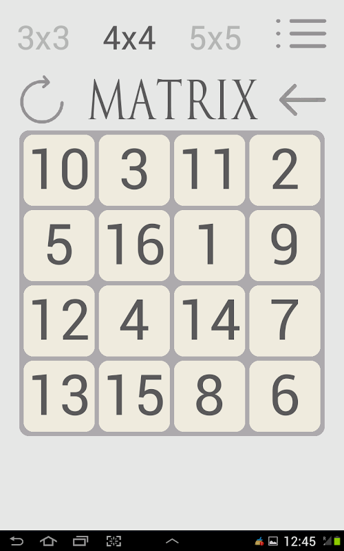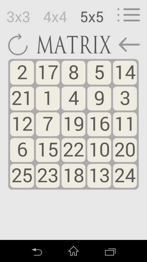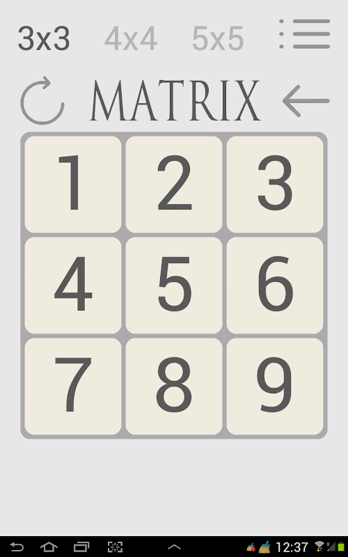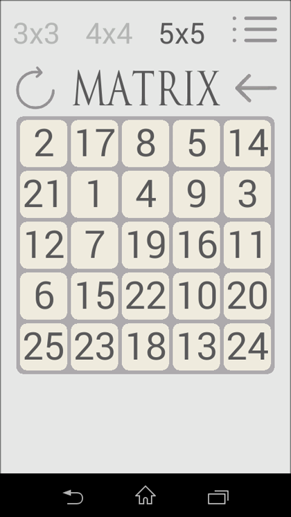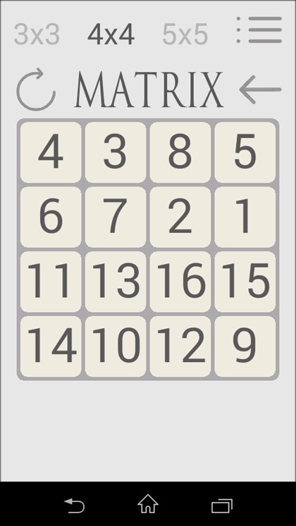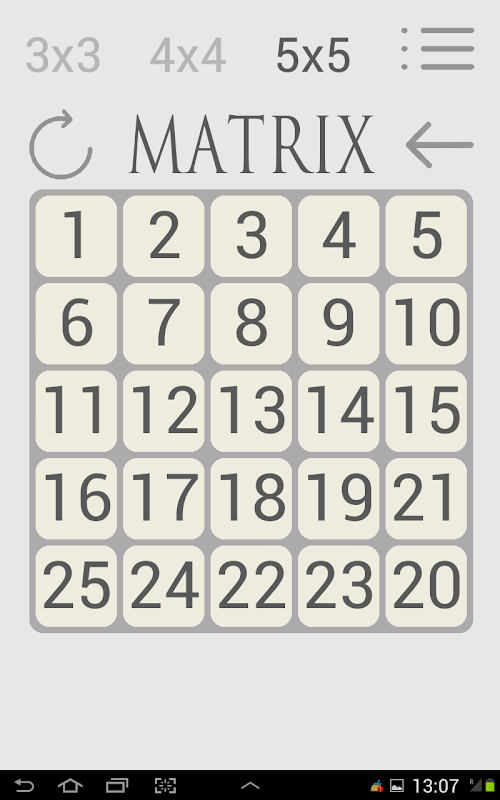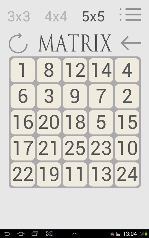 Matrix - an addictive puzzle that will help to take your time and stretch your mind. The game combines elements of "Rubik's Cube" and the familiar childhood game "barley-break". You will need to restore the sequential order of the numbers, "twisted" by the game. It is possible to select the size of the playing field: 3x3, 4x4, 5x5, which makes the game more interesting. Do you think there is nothing easier to collect sequence of numbers? - Try to do this!