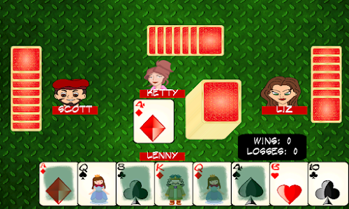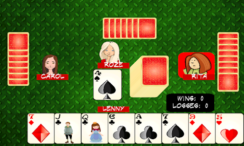One can play a card if it corresponds to the suit or value of the open card. on a 10 of spades, only other spades can be played or other 10s. If a player is not able to, they draw one card from the stack. If he can play this card, he may do so, otherwise he keeps the drawn card and passes his turn. If the drawing stack is empty, the playing stack is shuffled and turned over to serve as new drawing stack.