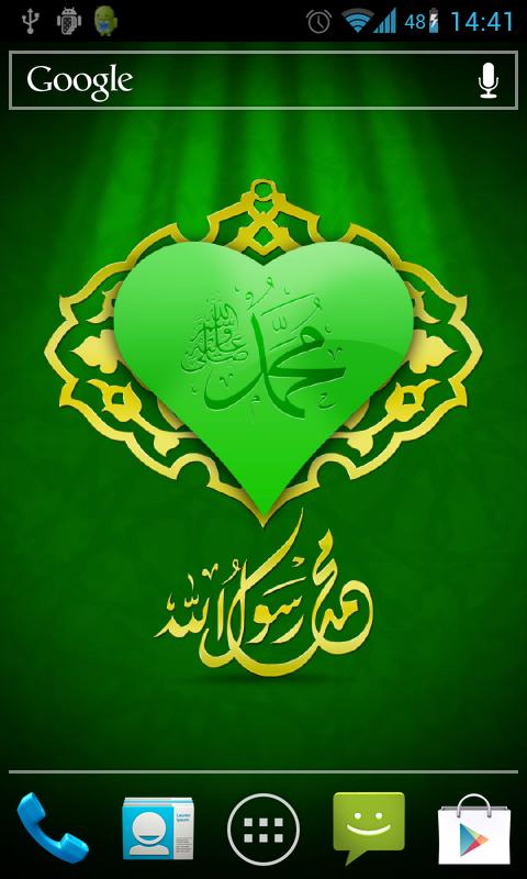 Show the importance of the day when the founder of Islam was born. This is the right moment to beautify your home screen and show your love for Muhammad with this wonderful Mawlid live wallpaper. This cute live wallpaper presents the sign of Mawlid and the name of Muhammad in the green heart. On the green background you can see the shining stars and wonderful ornaments that will make your android phone unique.