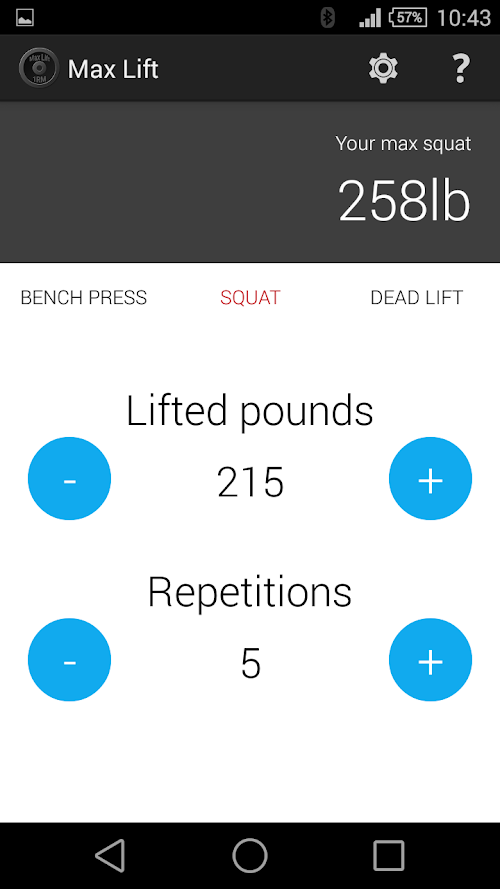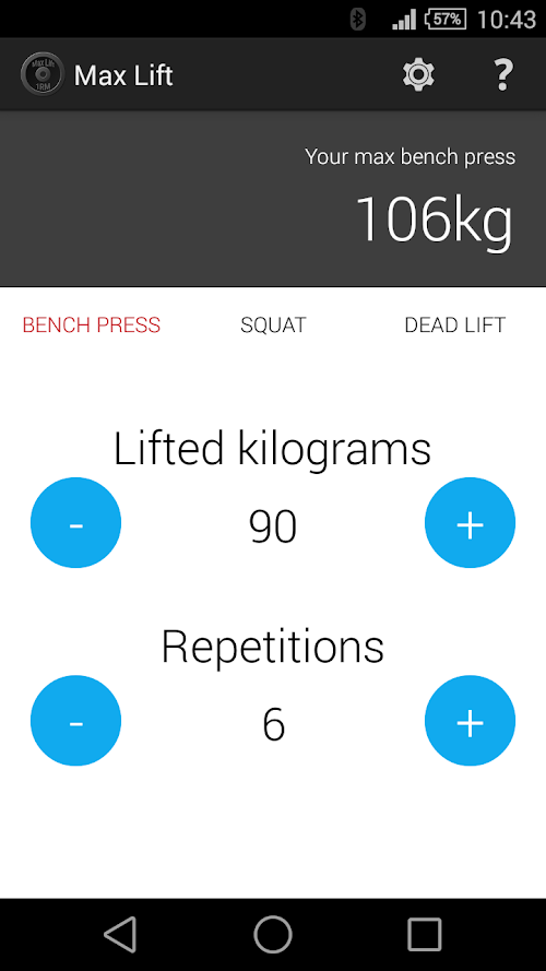 If you like weight-lifting and you are serious about training your muscles this app is perfect for you! Thanks to this elegant app you can calculate how much weight you can lift in one repetition in three diferent and the most important exercises: bench press, squats and dead lift. To do that, you just need to remember your results from your last training session. For example, if you lifted 90 kilos 6 times in bench press, then you should be able to lift maximum 106 kilos in one rep - this information will appear at the top of the screen. Of course you can change the settings and choose pounds instead of kilos.