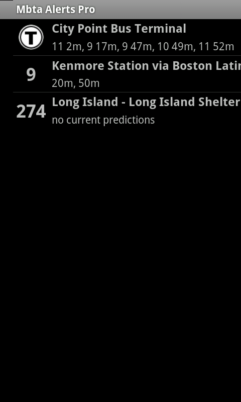 New pro version of MBTA Alerts. Adds predictions by stop, predictions on the bookmarks list, ability to bookmark stops, distance to stops, nearby stops, ... Also adds other frequently requested features and provides a vastly improved overall UI.