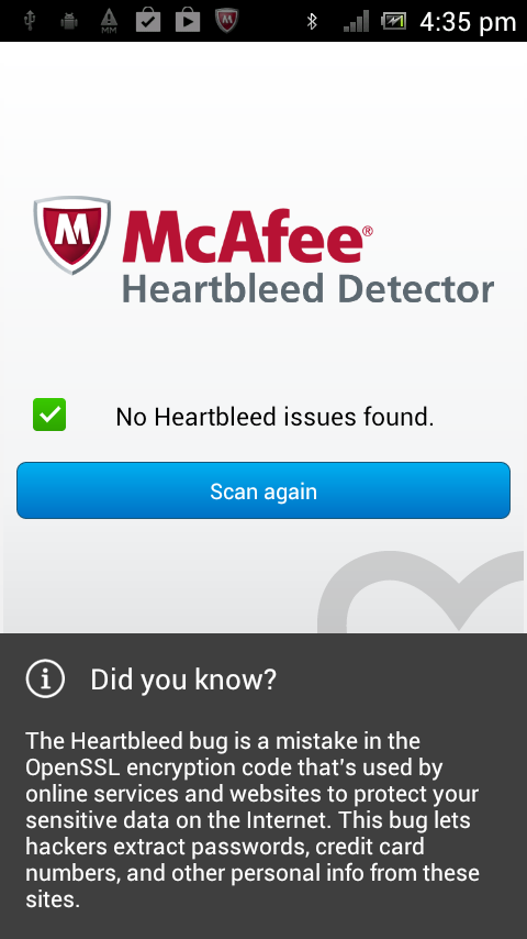 If you are looking to download other versions of McAfee Heartbleed Detector Android App, We have 1 version in our database. Please select one of them below to download.