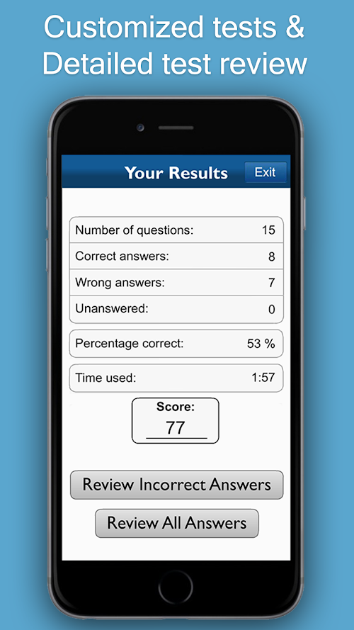 After each practice session your results with score are displayed, you can review questions and read a detailed explanation of almost every answer.