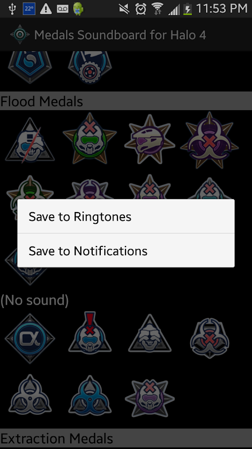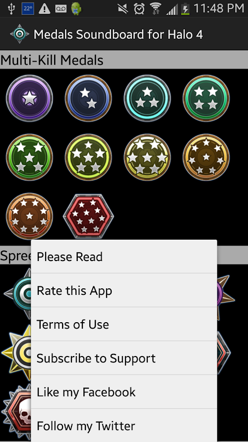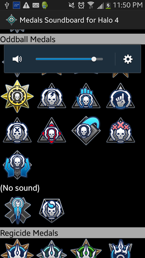 It has all of the Medals from Halo 4 including the ones with and without sounds. I organized them in the manner I thought was best. Please rate this app well, if there is something you want me to add or change just leave a comment and I will most likely do it, if it is reasonable.
