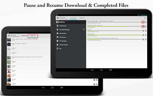 3.The sidebar icon located at the top left corner can swipe the view left to show the left menu view. In left menu view, we can see the Web Browser, Downloader Manager, File Manager, FTP Manager and so on. "Downloader Manager" shows the currently downloading files and completed file and in the "File Manager" tab , we can view the downloaded files saved in respective folders.