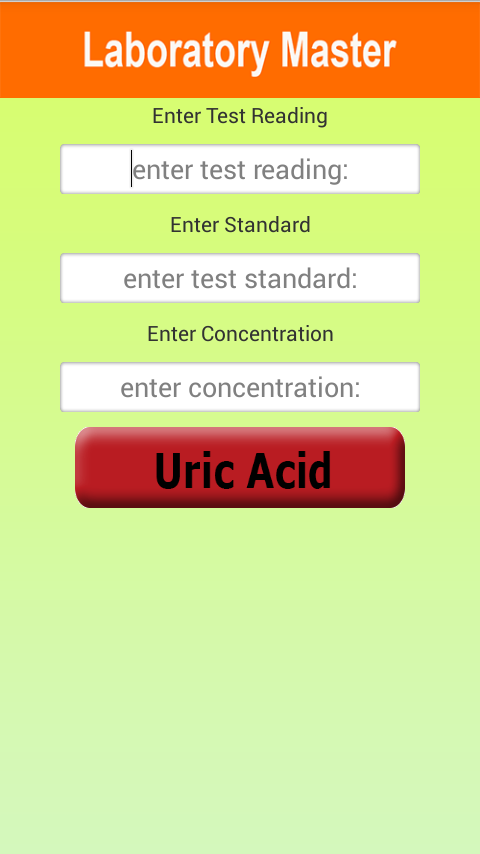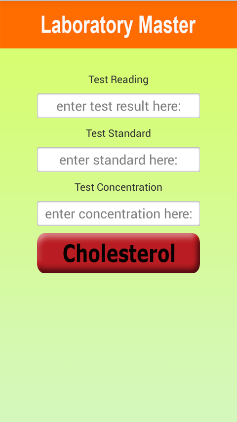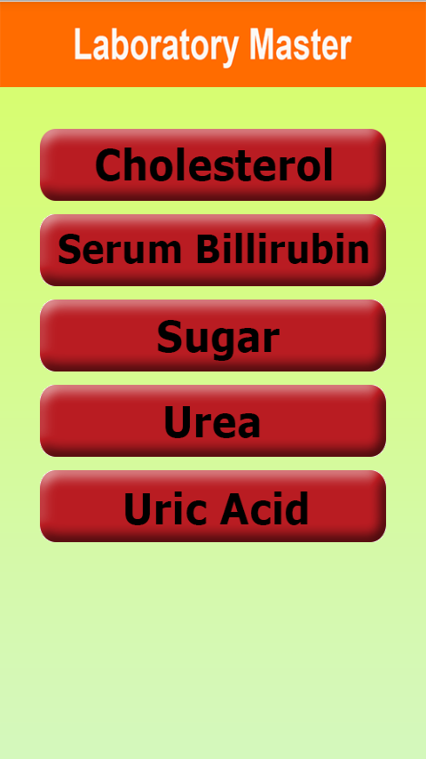 Medical Laboratory master is helping tool for the medical technicians to calculate their results without any trouble. They don't need to remember the formulas for calculating the final results. Medical Laboratory master is useful to find cholesterol, Serum Billirubin, Sugar, Urea and Uric Acid in a human body. This app is design to calculate the test results of a patient in any medical laboratory.