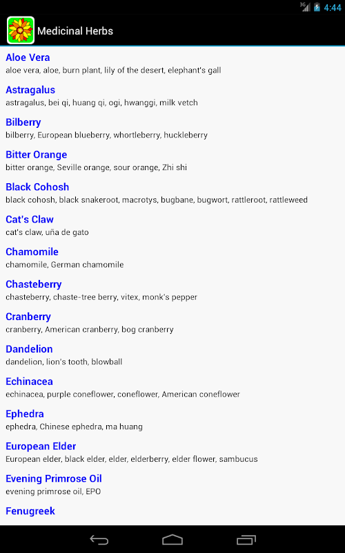 The herbs listed in the application reflects some of the top medical herb. Much of the time popularity translates into usefulness, but not always. There are some real herbal gems that don't generate so much "buzz", and wildly popular herbs that are not always the most beneficial in their class. Use the alphabetic listing above to find a herb by common name or botanical name.