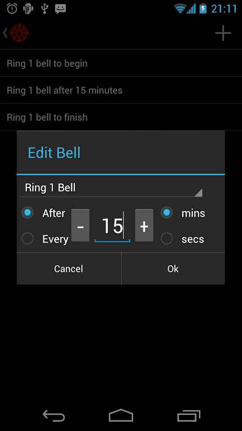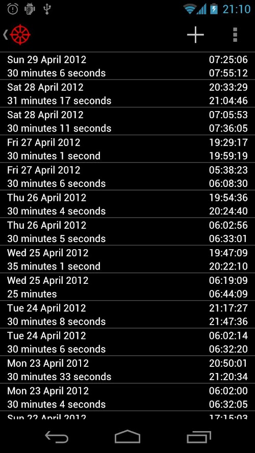 A meditation timer which allows you to set a target for the length of time you want to meditate each day. It includes a widget that displays the number of consecutive days you have hit the target. It is thus useful not only as a timer, but also as a tool to help motivate you to meditate regularly.