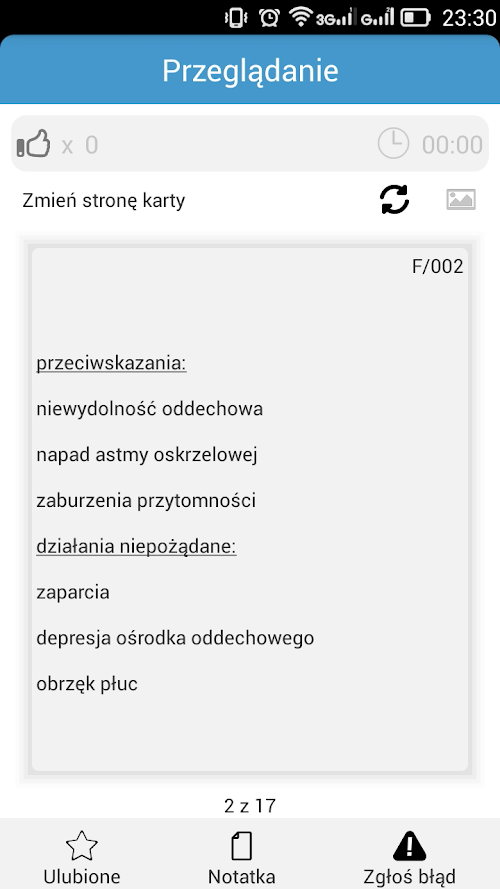 5. Aplikacja działa w dwóch trybach: przeglądania i testów. Możliwe jest przeglądanie i testowanie się z dowolnej partii materiału. MeduCards zapamiętuje zarówno czas pracy użytkownika i statystykę poprawnych i błędnych zaznaczeń w teście.