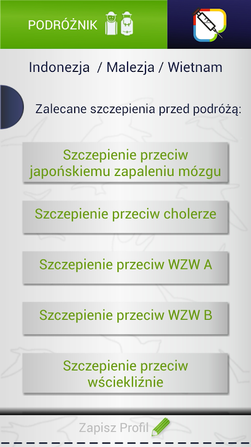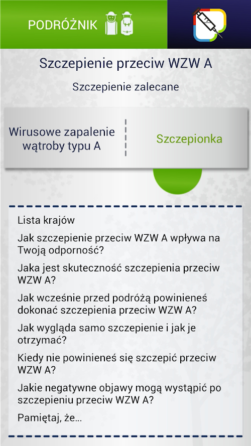 Dla podróżników aplikacja stanowi nieocenione źródło informacji na temat koniecznych szczepień w przypadku wyjazdu w dowolny rejon świata. Pozwala planować szczepienia oraz uzyskać informacje o czasie potrzebnym na przeprowadzenie cyklu szczepień, niezbędnych do wykonania szczepienia badaniach oraz o cenie szczepionek i ich dostępności.