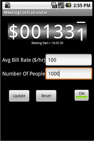 As of V1.75 If application is left running on navigate away or exit, when the app is resumed or restarted, the Odometer continues as if not exited, dollars are accrued against the meeting. If Turned off, the odometer and values are restored, but dollars are NOT accrued against the meeting. This allows exit, saving battery, but on reopen, is still accurate measure of meeting cost, and allows breaks in the meeting to not accrue against the meeting total