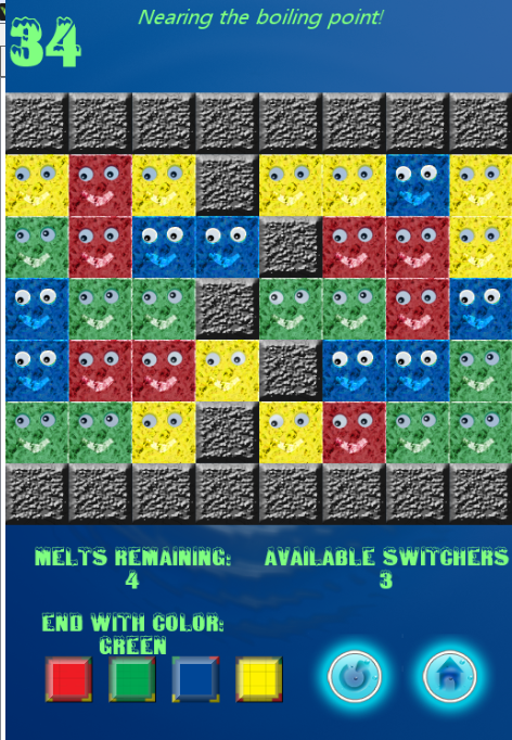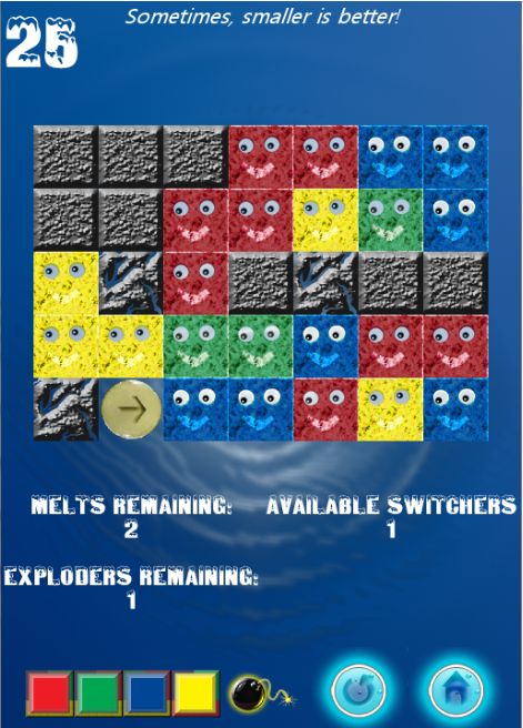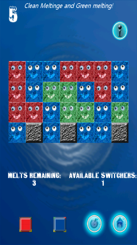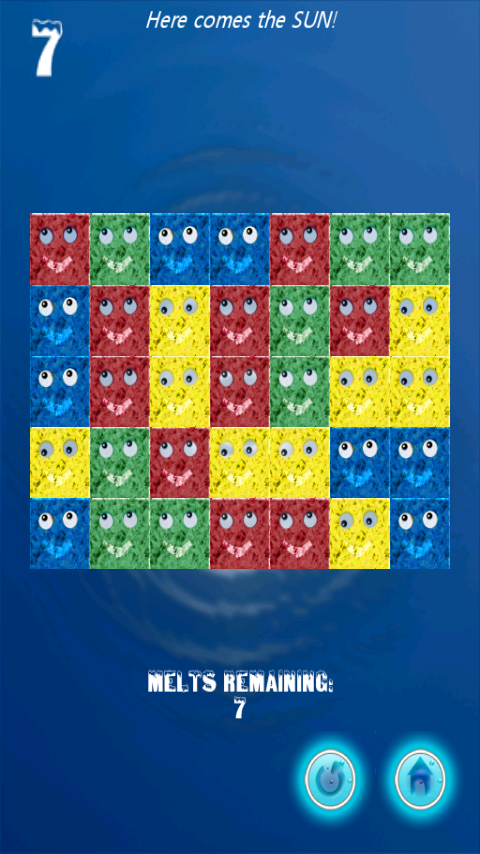 Meltinge is a great puzzle & brain game! And loads of fun too! Tap on differently colored ice cubes to melt them. Similar colored melted water initiates a chain reaction melting all adjacent blocks. Flood the screen with water using minimum taps possible! This sets the stage for various ultimate, colorful puzzles on your way. In come the elements like Switchers, Exploders, Rollers, Walls, Bonuses to help you out (and makes the game difficult too!)