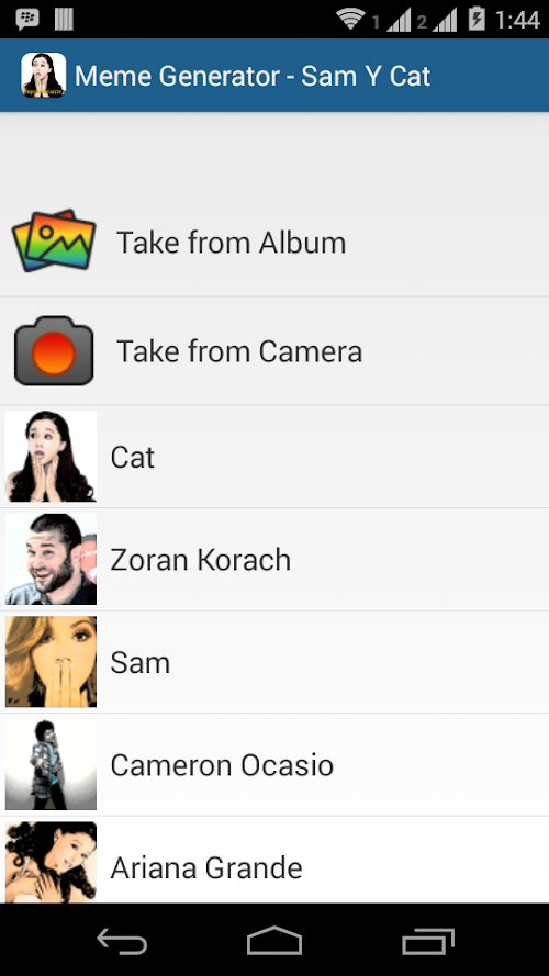 This apps contains 20 preloaded images of Sam And Cat cast. Therefore, you can also add your own image or take pictures with the camera immediately and create your memes.