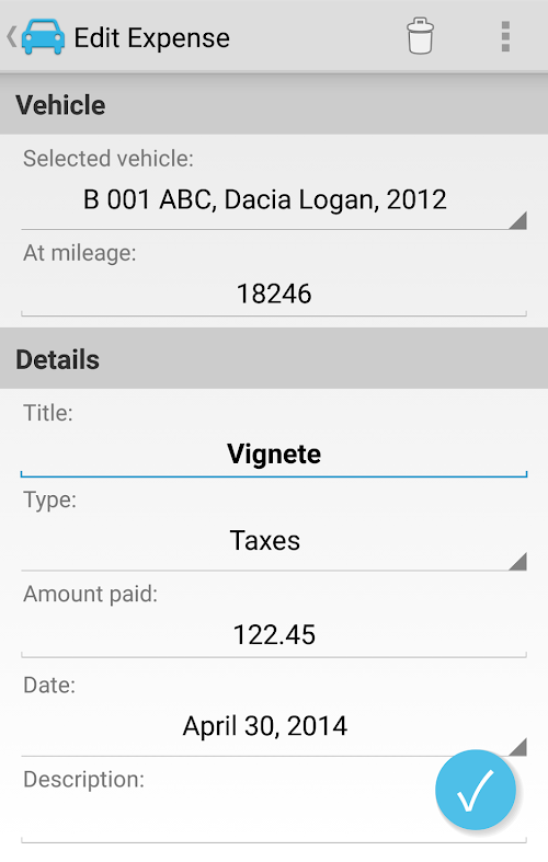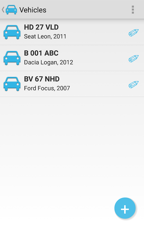 - Import/Export data: export all your data (vehicles, alerts, expenses) to a file, and use it to import them back. It can be used in order to move data to another device, or just to backup/restore data.