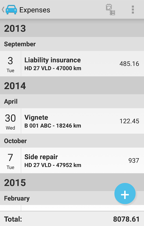 - Expenses section - add expenses and list them, apply filters (vehicle, expense type, time interval, amount paid) and aggregation (group by vehicle, expense type and time interval) and even view expenses within aggregated expenses items (view all expenses that are grouped inside one aggregated expense).
