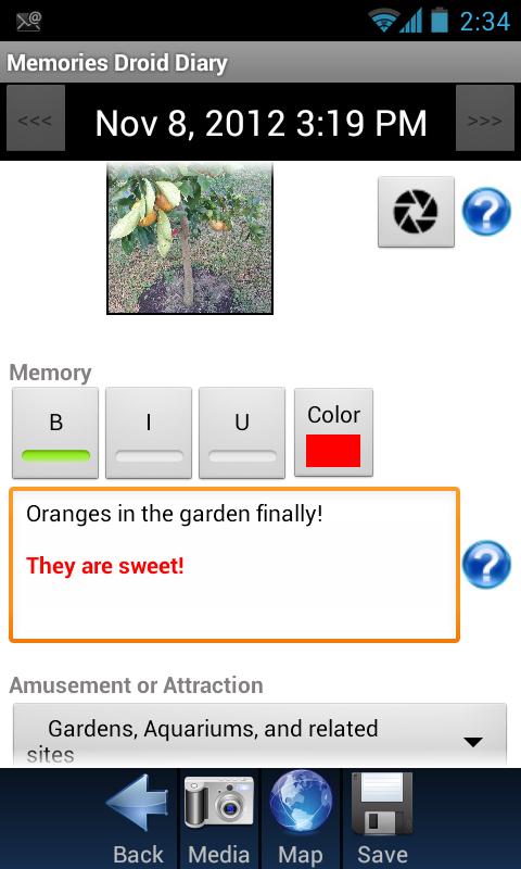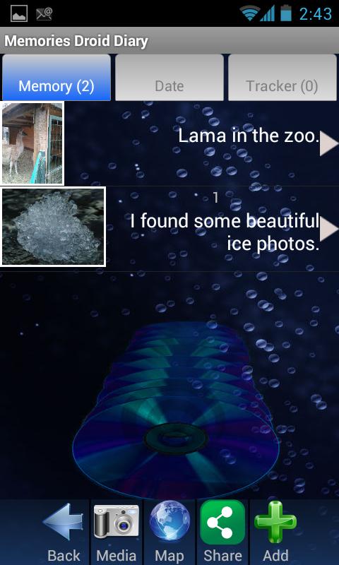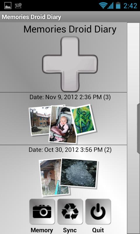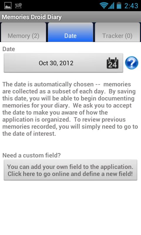 The Memories Droid Diary is a MajorForms android application that allows you to track and document each day with your memories incorporating images, video, audio recordings, emoticons, and even the weather and moon phases. It also allows you to track (with GPS) all or parts of your day and enables the data to be synchronized to a free website created by you to store, edit, and/or share your memories with others (this is optional if you do not wish your diary shared). You can also allow family and friends to view your memories on Facebook or Google+, Twitter, Linkedin, e-mail, etc. (optional also). Once your memories are backed up to our secure server (again optional) or to your website, you can edit the data, create reports and/or maps, and download the data or reports to spreadsheets or other documents. You do not need to have access to the internet to run the application, but if you do, your data can be backed up through automatic synchronization with the secure database (not required). It is important to note that your diary is password protected -- outstanding security measures have been adapted to protect your memories.