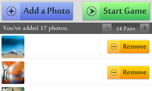 Choose up to 20 photos from your local photos gallery or online albums to play the classic pair matching memory game. A highscores table is also available to keep track of your results.