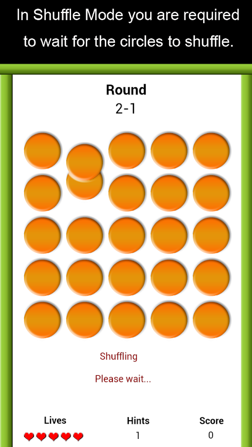 Shuffle mode however makes you wait for the circles to shuffle before you can start tapping, but the circles will stop moving once the shuffle round is over. This mode forces you to not rely on your immediate photographic memory but in turn does not require as much attention , focus and concentration as roaming mode .