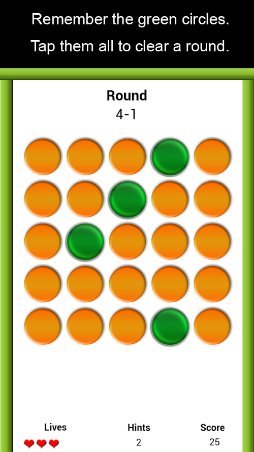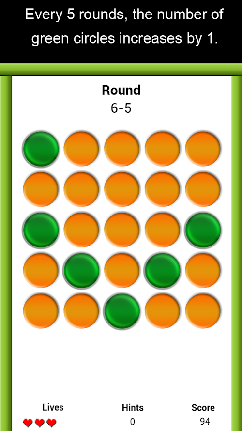 Every 5 rounds, the number of green circles increases by 1. If you are unsure of how many circles will be revealed on the current round, you can look at the round number at the top of the screen. For example, round 4-3 would be the 3rd round with 4 green circles. If you forget which circles are left, you can press on the hint button. However, you only have 3 hints per game, so you need to use them with care.