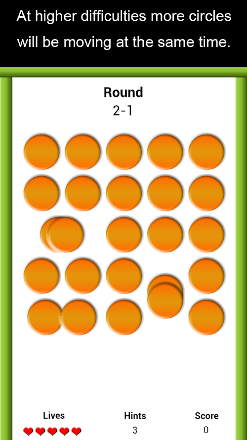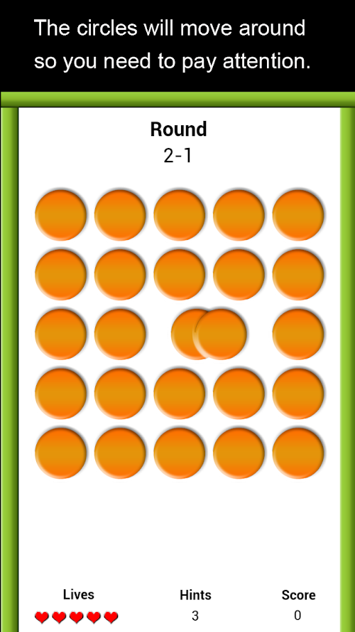 The goal of the game is simple. You need to remember which of the circles on the screen turn green and then tap on them in order to score points and not lose your focus when they start to move around. When you've tapped on all of the circles that turned green, a new round will begin, and new green circles will start revealing themselves. Once the circles have been revealed, all of the circles will start to shuffle , so you need to pay attention . If you tap on a wrong circle you will lose a life. When all of your lives are lost, the game will end. Keep in mind that you may not tap on circles while they are moving .