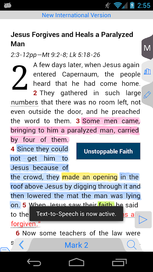 • Bible talks to you! Text-to-Speech allows the Bible to be read to you out loud