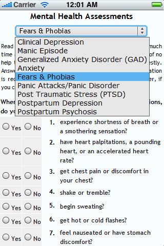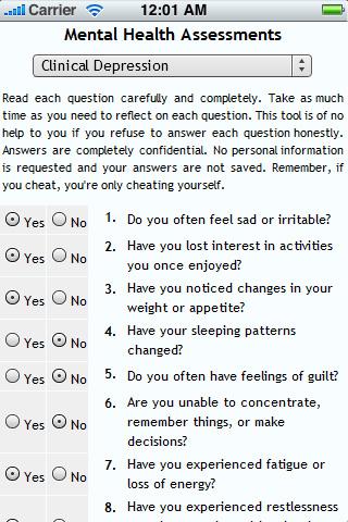 This app consists of common mental health assessments (surveys) similar to those used by triage nurses to estimate mental health state. The assessments include: