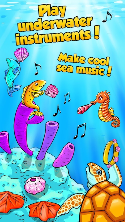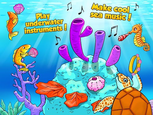 Meet Mr. Turtle near the coral reef and learn to play sea instruments. Tap the musical instruments and create your own music and songs!