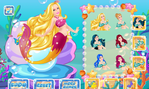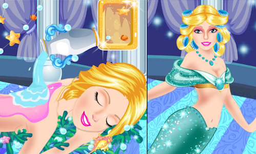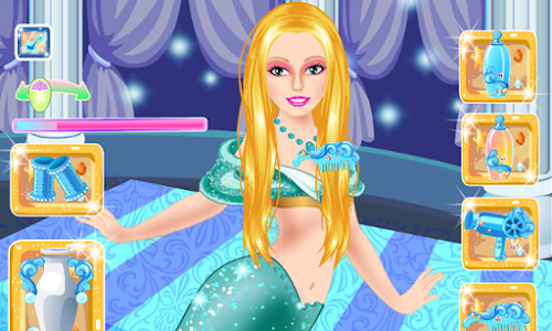 This game introduces you in the amazing water world, where you'll met the most beautiful mermaid princess. And now she reveals her beauty secrets to you. In the first part of the game you'll see how she relaxes at the spa salon. Then go through some simple hair care steps. In the third part of the game discover her amazing wardrobe and dress her up as you like. Now she looks gorgeous isn't it?
