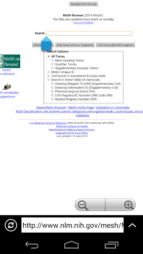 The MeSH Browser is an online vocabulary look-up aid available for use with MeSH® (Medical Subject Headings). It is designed to help quickly locate descriptors of possible interest and to show the hierarchy in which descriptors of interest appear. Virtually complete MeSH records are available, including the scope notes, annotations, entry vocabulary, history notes, allowable qualifiers, etc. The browser does not link directly to any MEDLINE or other database retrieval system and thus is not a substitute for the PUBMED system.