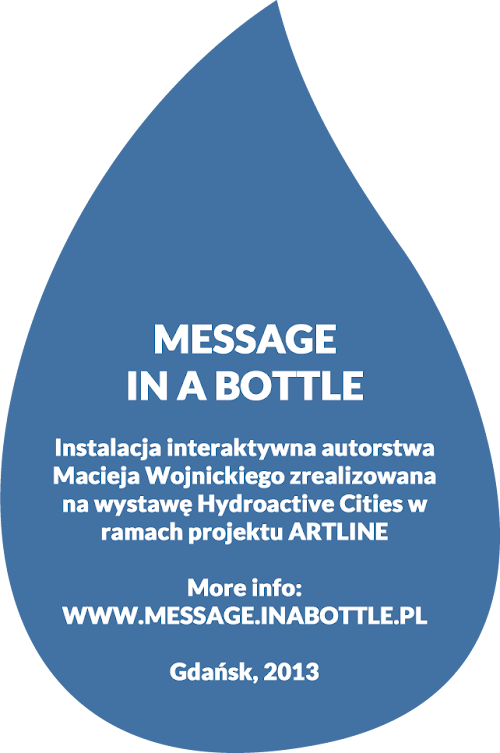 “Message in a bottle” jest interaktywnym przedsięwzięciem artystycznym, opartym na zaprojektowanym specjalnie w tym celu narzędziu komunikacyjnym, łączącym aplikację na system Android oraz stronę WWW. Projekt ma charakter zbliżony do idei gry miejskiej. Uczestnicy eksplorując teren wzdłuż kanału Raduni – od budynku Urzędu Miasta do ujścia Motławy – poszukują naściennych graffiti i tagów. Kierując w ich stronę komórki lub tablety z pobraną wcześniej aplikacją, uczestnicy natykają się na wirtualne butelki z wiadomościami /historiami, krótkimi zdaniami, pytaniami czy zdjęciami/, pozostawionymi przez swoich poprzedników uczestniczących w „grze” na które mogą odpowiedzieć. Każda wiadomość zostaje wirtualnie zapakowana i z powrotem rzucona w nurt Raduni. „Message in a bottle” jest próbą stworzenia alternatywnej sieci komunikacji miejskiej, która przy wykorzystaniu współczesnych technologii nadaje nowe sensy komunikacyjnej funkcji wody. "Message in a Bottle" is an interactive art project, based on designed specifically for this purpose communication tool that combines the application to the Android system and web page. The project is similar to the idea of urban game. Participants exploring the area along the canal Radunia - from the City Hall to the mouth Motławy - looking wall graffiti and tags. Following their way out of the cell or tablets taken before the application, the participants come up against a virtual bottle of news / stories, short sentences, questions or pictures /, left by their predecessors participating in the "game" to which we can respond. Each message is virtually packed and thrown back into the stream Radunia. "Message in a Bottle" is an attempt to create an alternative public transport network, which with the use of modern technology gives new meanings transport water feature.