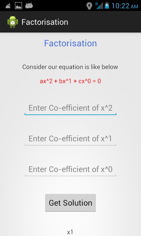 Application to solve mathematical solutions automatically in simple manner. its deals with Factorisation, Differentiation, Integration & Linear Equation