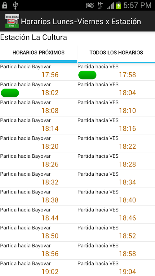 Revisa los horarios de cada estación por dias: Lunes-Viernes, Sabados, Domingos-Feriados; ubica los horarios de salida próximos hacia las estaciones de Bayóvar y Villa El Salvador