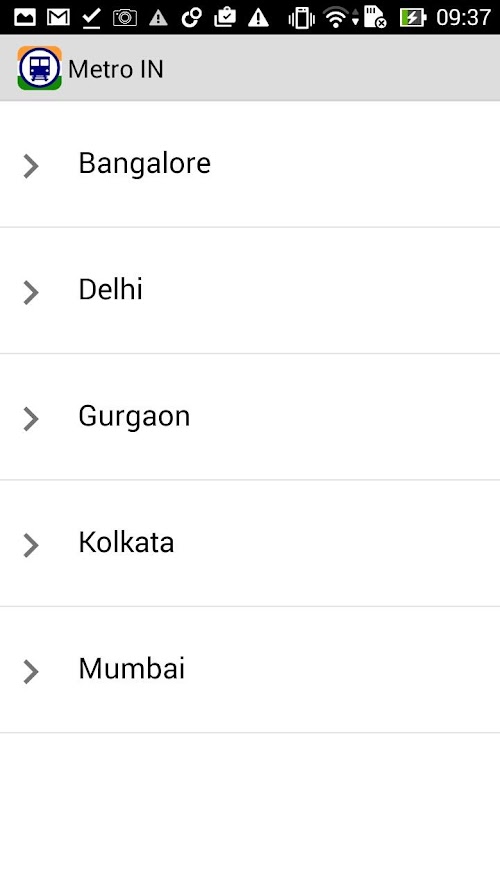 Display Bangalore, Delhi, Gurgaon, Kolkata and Mumbai subway maps in one click without internet access.