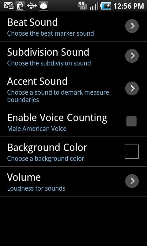 The phone's menu button accesses additional settings. Select your preferred beat sound, subdivision sound, accent sound, enable voice counting, change the background color, and change the volume. The phone's physical volume buttons also change the volume.