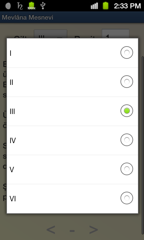 Selam üzerimize olsun. Ekranda her seferinde beş(*) beyitin çevirisi görüntülenir. Sayfa değiştirip, sonraki yada önceki beş beyiti görmek için ekranın altında ok işaretlerinin bulunduğu yerde parmağınızı sağa ya da sola doğru kaydırın. Ayrıca doğrudan cilt ve beyit numarası da seçebilirsiniz. Uygulama her seferinde daha önce kaldığınız sayfayı açar. Beyitleri paylaşmak için yazının üzerine basılı tutun.