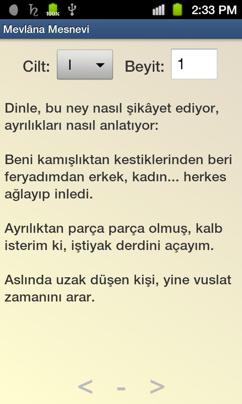 (Only available in Turkish)Peace be upon us. Five at a time on the screen (*) verse translation is displayed. Change page, slide your finger left or right arrows on the location of the bottom of the screen to view the next or the previous five couplets. You can also select directly on the skin and verse number. The application opens the pages you have previously stayed at a time. Write to share couplets on hold.