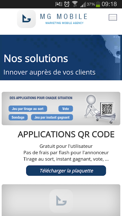 - Marketing mobile avec l’organisation de jeux concours ou vote par SMS, par Twitter et par QR codeMG Mobile is a mobile marketing agency specializing in mobile development. It supports companies in the acquisition, development and retention of their mobile audience.