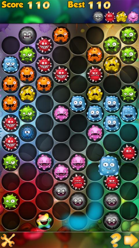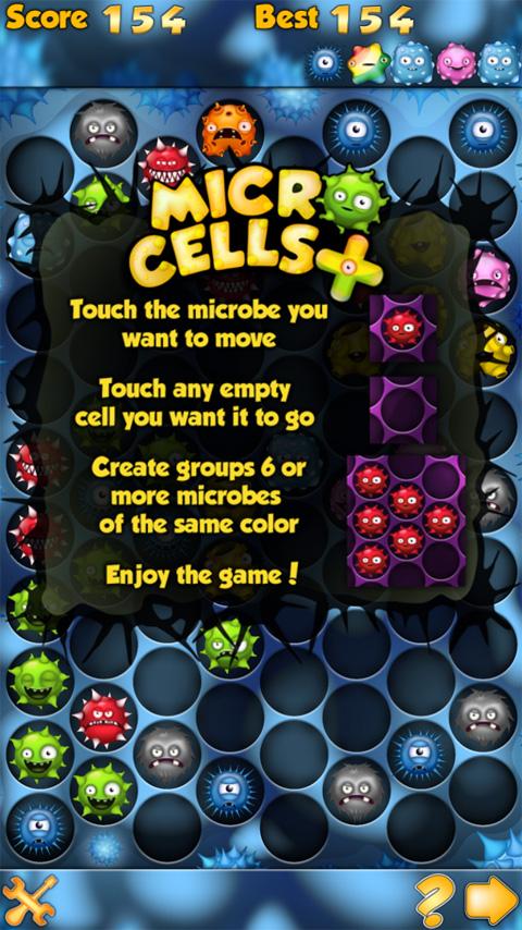 MicroCells Plus is a highly enjoyable game. Once you start, you won’t want to stop. The goal of the game is to clear the field from cute microbes. Try it, and see how high you can score. You have to group six or more microbes of the same color together. Once the microbes are grouped, your score increases, and the grouped microbes disappear to make room for more maneuvers. After each turn, your device puts more microbes on the board and your task becomes more difficult. The game is over when the board completely fills up. Enjoy the game!