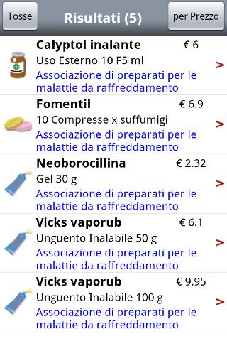 - visualizzazione dei risultati in ordine di prezzo crescente, per facilitare la scelta del medicinale più economico