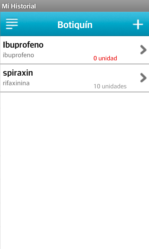 Lleve un control de los medicamentos de su botiquín, miHistorial app le avisará cuando le quede menos de un 10% de su medicamento en el botiquín. Puede dar de alta Comprimidos, capsulas, sobres, jarabe, gotas, pomada, inyectable, ampollas, parche, etc.