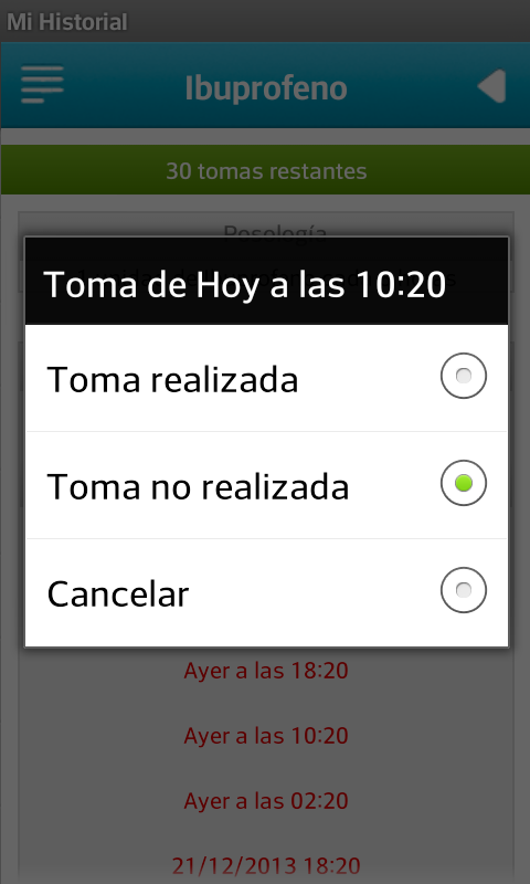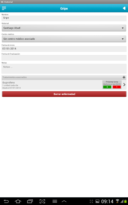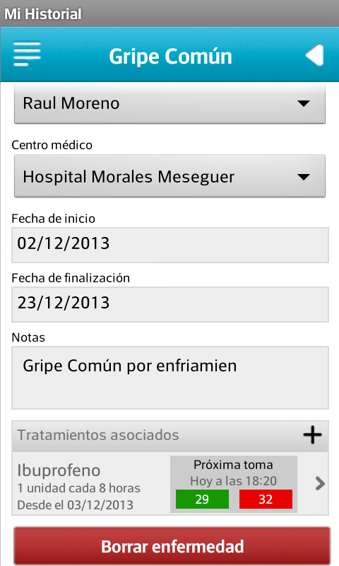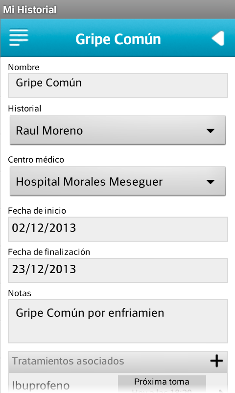 Añadiendo un tratamiento miHistorial app le recordará cada una de las tomas, programando las tomas diarias y el número de días. Automáticamente la aplicación añadirá a la agenda de su teléfono cada una de las tomas del tratamiento.