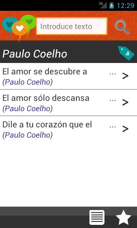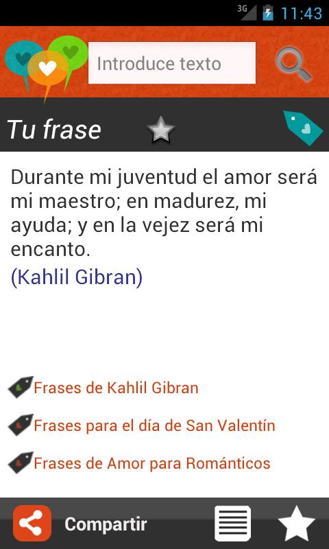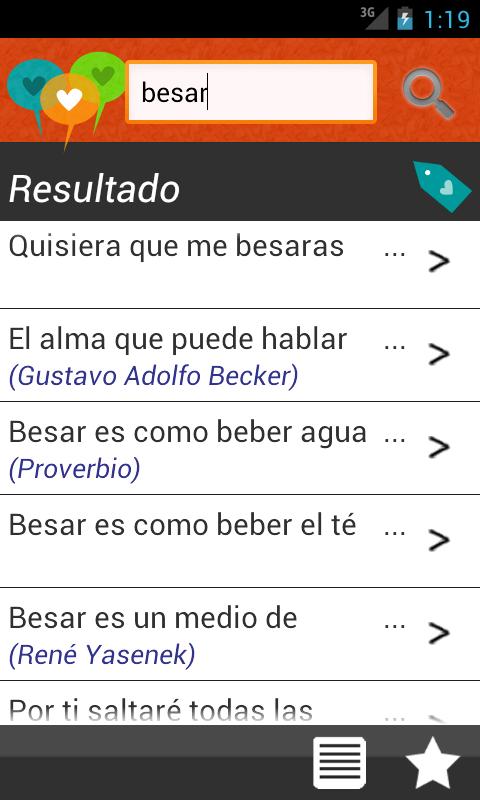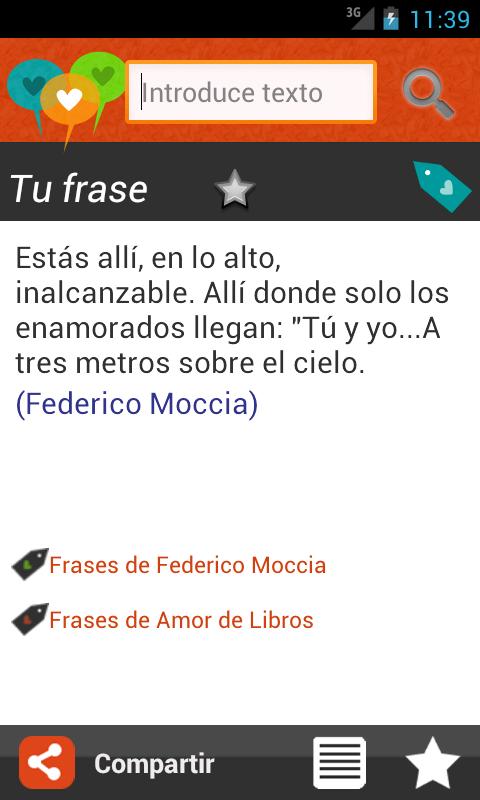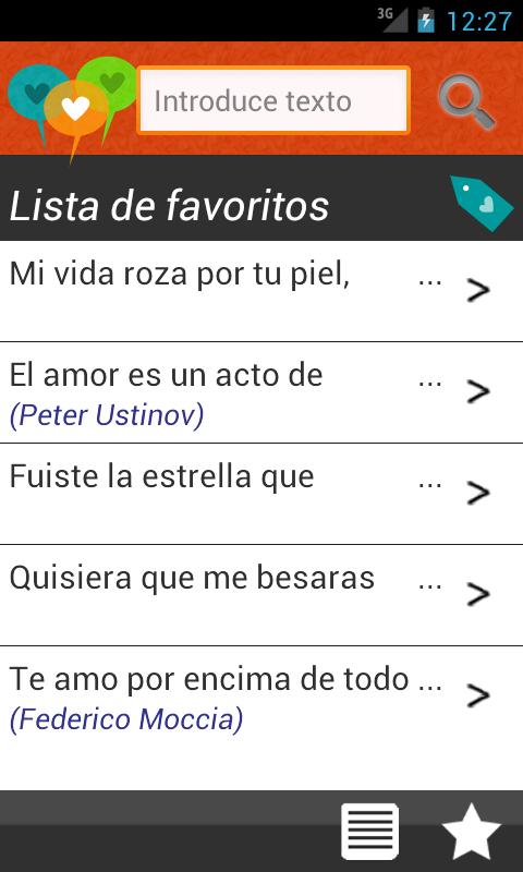 Mas de 1.000 frases de amor en esta aplicación para enviar a esa persona especial. Frases de amor para todo tipo de ocasión, agrupadas en categorías para facilitarle la selección al usuario. Aplicación ideal para aquellas personas que no saben componer frases románticas pero sí desean compartirlas. Y también para enamorados que quieren conquistar su deseado con frases de amor originales, famosas, bonitas. ¡Enamórale ya! Aquí tienen frases para alimentar una relación de amor durante años.More than 1,000 words of love in this application to send to that special person. Words of love for all occasions, grouped into categories to help you select the user. Ideal for those who can not compose romantic phrases but want to share application. And for lovers who want to win their desired original phrases, famous, beautiful love. Enamórale now! Here are phrases to feed a love for years.