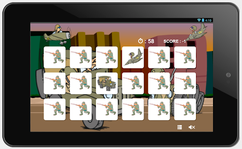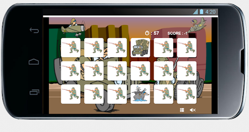 Military war fighter with a car in the game, it's fun-filled tanks, warships, military aircraft used in the war, and it prevents the city. To build a good memory to match the car and aircraft and warships on the same in Games military vehicles together. Strengthen the memory of the kids is easy, whether boy or girl can play easily in the game will include a card with a tank or a battleship or aircraft overturned. Click the photo to the children each click or touch the photo and the photo's second match up the picture that I do not have to decorate a difference is not difficult. Children easily recognize him, trying to remember the position of the first to open mine to open a second to match it. When opening the image corresponding to the younger children, it added. But to try to match the portrait to be completed within the specified time before the game ended, my friends have some fun with the kids fun games.