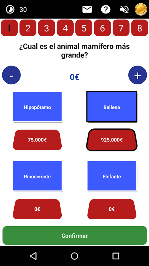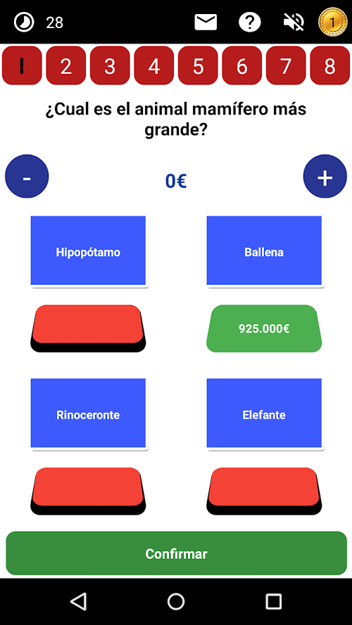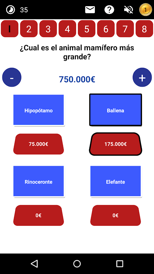 Early in the game are available € 1,000,000. Player has to choose a category from two options. Then appears a question related to the chosen category with different answers. To answer, money must be distributed, grouped in blocks of € 25,000, leaving at least 1 answer without betting. Money in wrong answers will be lost, to the next round you'll only have the money from right answer. If there is no money game ends. In total there are 8 rounds. The goal is to pass eighth questions with most money won. Will you be able to catch a million or the cash drop?