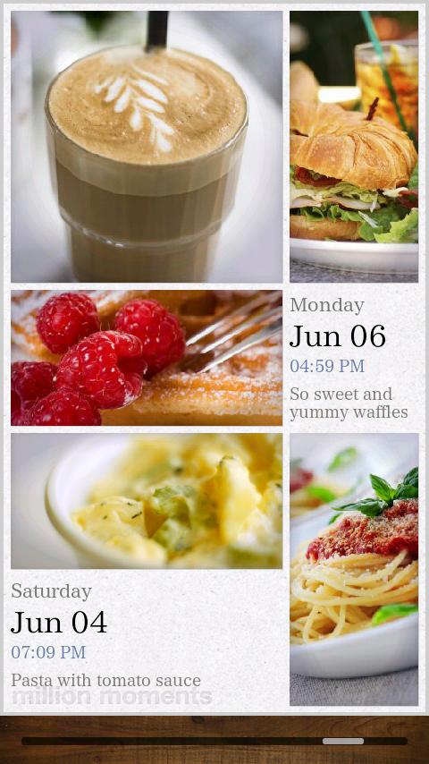 Pictures pile up on your smartphone. Don’t let your cherished memories languish in a forgotten corner of your phone. Bring them alive with million moments, a photo viewing and sharing application that lets you enjoy and share your favorite pictures in elegant, magazine-like layouts.