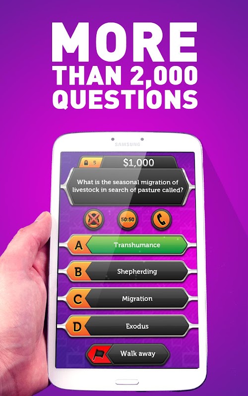Play Millionaire for free and demonstrate that you are the one that knows more. The quiz contains more than 2000 general questions and two modes where you can test your cultural knowledge.