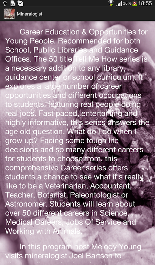 In this app host Melody Young visits mineralogist Joel Bartsch to discover the real value of minerals and gems. Subjects Covered Include: What does a mineralogist do? Are all minerals valuable? What is the difference between a mineral and a rock? What is the most precious mineral? Why do they use minerals in toothpaste? Why are some minerals so colorful? What is fools gold? What is a gemstone? What makes a mineral valuable? What is a carat?
