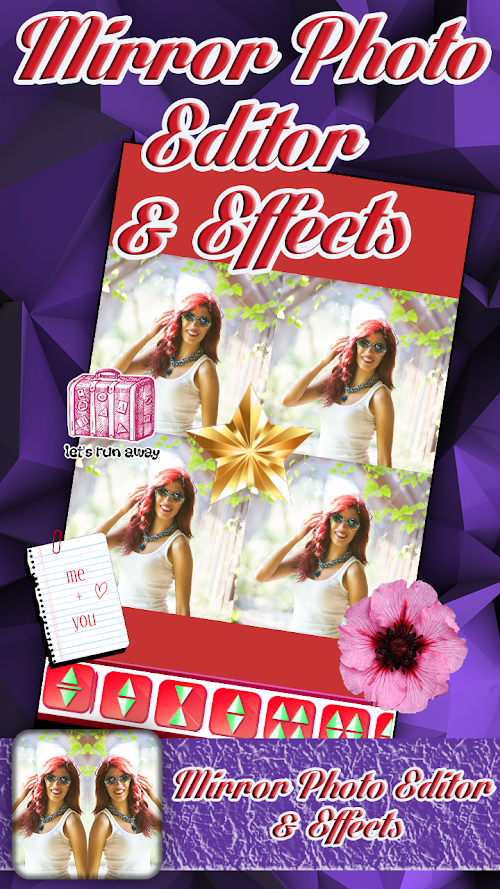 Get Mirror Photo Editor & Effects and create your own mirror picstory free. For those of you who have wondered ‘how to edit pictures’ to create insta “mirror photos”, we have designed a new cute girl selfie photo editor - Mirror Photo Editor & Effects-. This fancy “mirror camera” with effects enables you to apply amazing photo reflection effects and decorate pictures like a photo editing pro. It makes it easy to create fabulous mirror images by offering a wide choice of special effects for pictures, insta pic frames as well as cute stickers and stamps. Different styles of reflection for pics will definitely add a spark to your picmix for AndroidTM and make you an expert in cute picture editing.