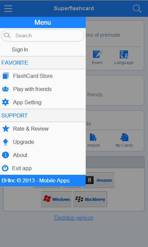 This app is also available on Apple App Store, Amazon Kindle App Store, Blackberry App Store and Windows Phone App Store. Please visit us at http://about.superflashcard.com/tour/ for more information .